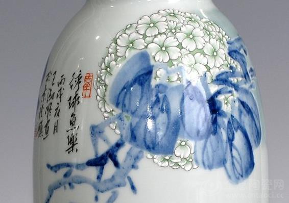 王淑凝的作品《绣球鱼乐》瓷瓶,运用古朴素雅青花色调作为创作的基调,构图大胆多变,色彩清新明快,在简洁的笔触与装饰美感中进入了空灵唯美的意境,给人以秀逸鲜活、简约生动的艺术感受。作品具有综合装饰的手法,也表现了纯美的诗意境界。