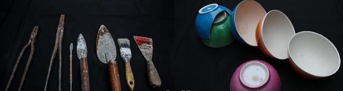 剪瓷雕”的“剪刀”非同一般。它形似平口老虎钳,但钢口不能太硬,如果硬碰硬,就容易将瓷片剪碎。这种钢口偏软的剪刀,长度在25cm到35cm,它在熟练的艺人手里,能很快地将瓷器分割成各种形状,再修整出所需要的、边缘光滑的瓷片。
