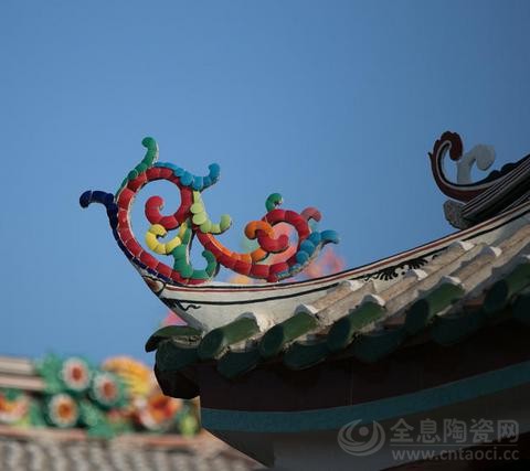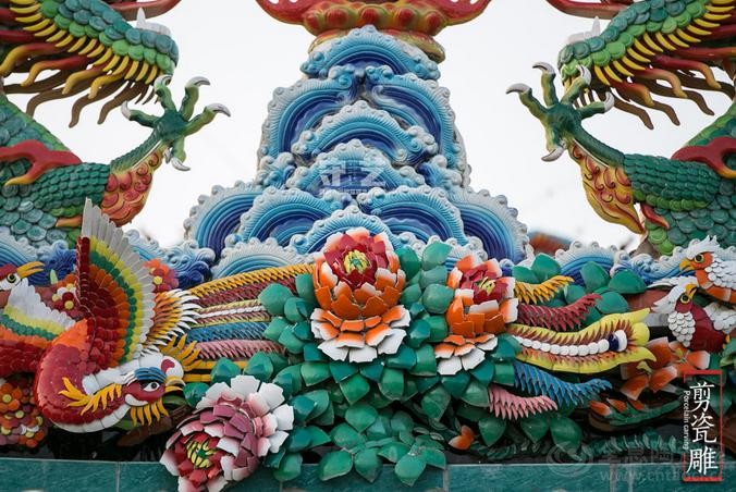 剪瓷雕融合了泥塑、绘画、色彩、雕刻之所长,色彩艳丽,不易剥蚀。任凭日晒雨淋以至寒冷炎夏的浸袭,彩瓷剪贴依然熠熠生辉。
