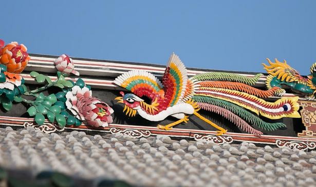一般来说,位于屋脊下堵头位置者多半为花草图案。以瓷碗表现花叶的立体感是最为常见的表现手法,其运用面最广,也最体现剪瓷雕绚丽的色彩。