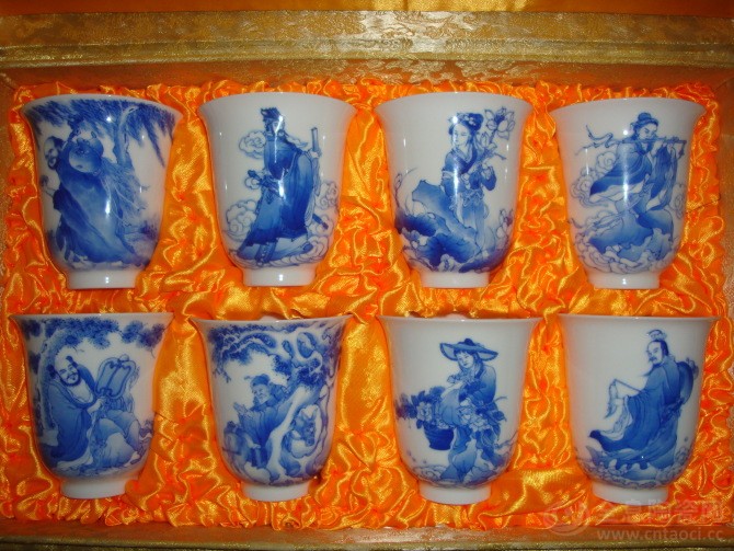 “八仙”即张果老、吕洞宾、汉钟离、韩湘子,铁拐李、何仙姑,蓝采和,曹国舅,是古代神话传说中的八位神仙。相传他们学道成仙,各有一套本领,故有“八仙过海,各显其能”之说。八仙所持之物;张-鱼鼓、吕-宝剑、汉-扇子、韩-花篮、铁-葫芦、何-笊篱、蓝-横笛、曹-阴阳板,被称为“暗八仙”。明嘉靖后,八仙成为瓷器的常见装饰题材之一,有“八仙过海”、“八仙祝寿”、“八仙捧寿”等内容,清初仍较流行。有的图案仅画八仙所持的葫芦、扇子、鱼鼓、笊篱、横笛、宝剑、阴阳板、花篮八种宝器,称为“暗八仙”。是清代景德镇窑瓷器的常见纹饰。