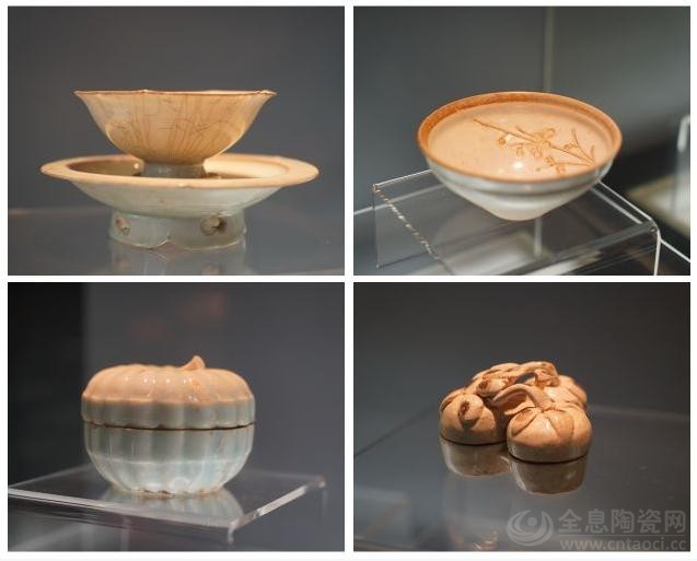 ↑5月18日,邹兰英在展示一套北宋年间的白舍窑青白瓷茶具。这是白舍窑展览馆内展出的部分展品(拼版照片,5月18日摄)。