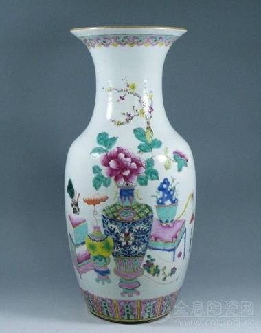 到了同治年间,粉彩嫁妆瓶就较之前几朝多了许多。由于社会的不稳定,瓷器上多见祈求平安幸福的题材,这与当时人们普遍的思想追求分不开。这时瓷瓶的造型也逐渐由盘口瓶转向撇口瓶,粉彩的嫁妆瓶已开始大量出现。
