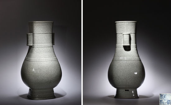 清雍正哥釉贯耳弦纹大方瓶 北京保利2011秋拍夜场《中国古董珍玩夜场:清瓷颜色釉别裁》 1500万的价格落槌