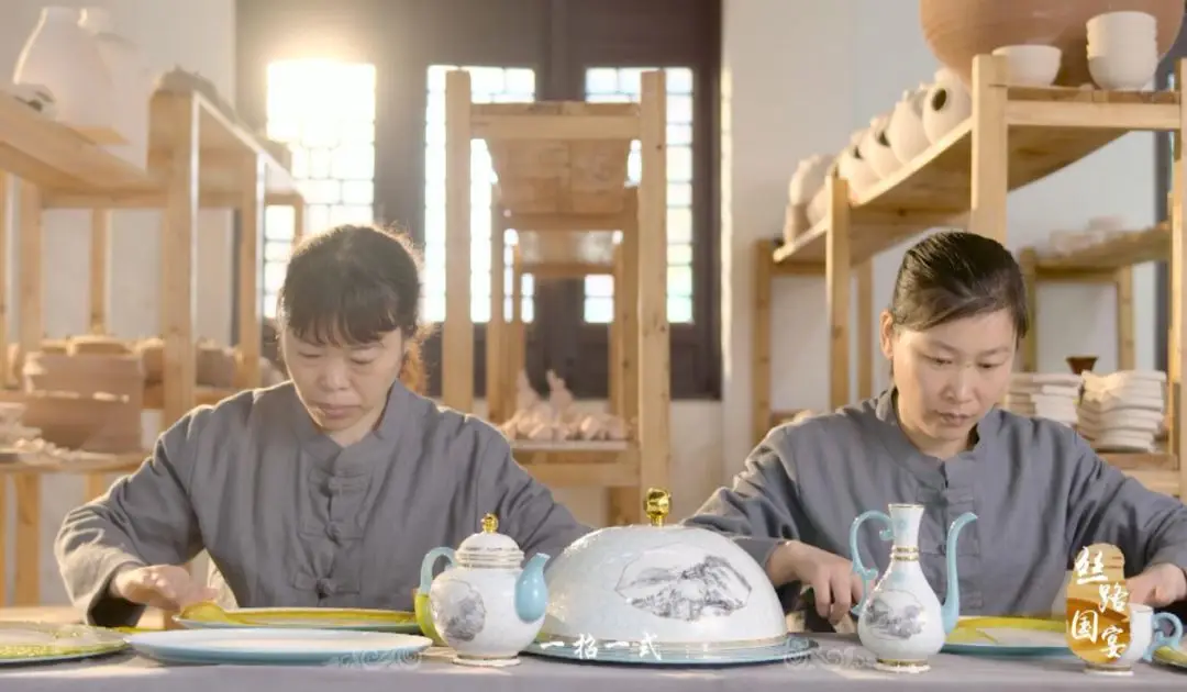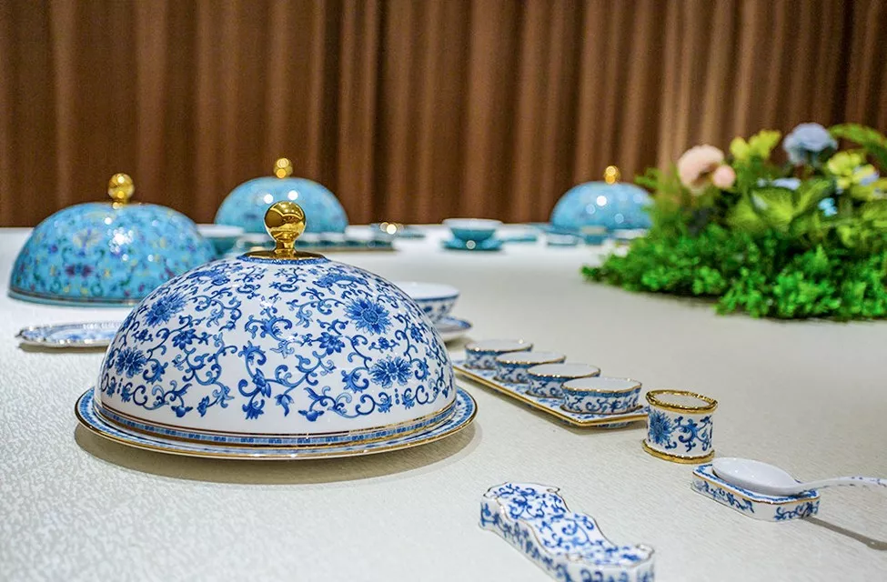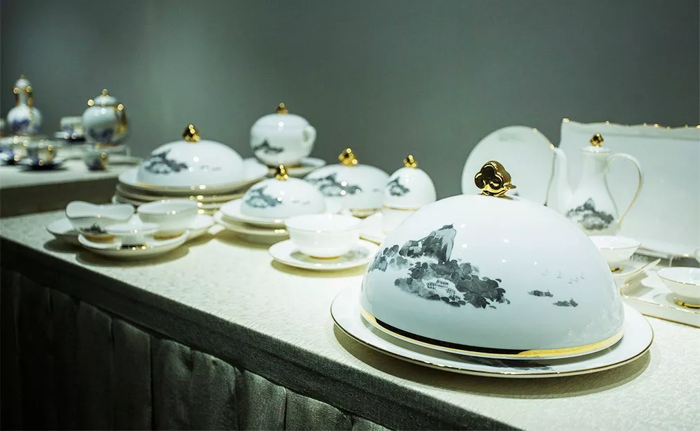 高淳陶瓷博物馆二楼展出的是一套套色彩鲜艳、设计大气、器具齐全的国家用瓷,包括20世纪抗战胜利、建国10周年庆祝大典等国家重要时期用瓷,以及21世纪以来在我国举办的APEC峰会、上海亚信峰会、G20峰会、北京“一带一路”高峰论坛、金砖国家峰会、内蒙古自治区成立70周年礼品瓷等时期的国宴瓷,共有15套,其中有7套为高淳陶瓷生产,展现了当代中国国瓷风采和最高技艺。
