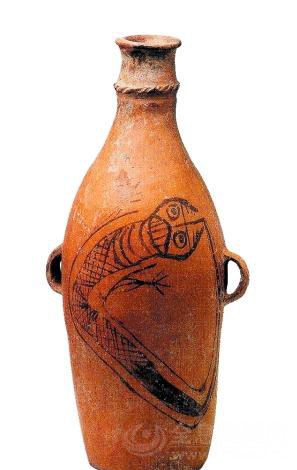 鲵鱼纹彩陶瓶(如左图所示)是新石器时代庙底沟类型晚期器物(庙底沟类型的年代据碳14测定为公元前3900年~前2780年)。1958年,它出土于甘肃省甘谷县西坪遗址,1996年9月国家文物局馆藏一级文物专家确认组将其定为国宝,现为甘肃省博物馆镇馆之宝。