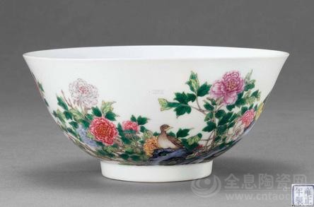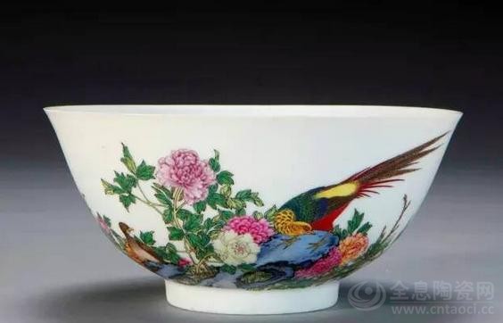 不得不承认,还没有哪一个朝代的珐琅彩瓷器如雍正朝的那般典雅秀丽,以瓷胎为画绢,布局章法继承了中国画融诗、书、画、印于一体的传统。我们可以用《陶雅》中之语评价雍正朝珐琅彩瓷器:“质地之白,白如雪也,一绝也;薄如卵幕,口嘘之欲飞,二绝也;以极精之显微镜窥之,花有露光,鲜艳纤丽,蝶有茸毛,且颈项竖起,三绝也;小品而题极精之楷篆各款,细如蝇头,四绝也。”我们看到的这件珐琅彩雉鸡牡丹纹碗,正是这“四绝”的完美体现!
