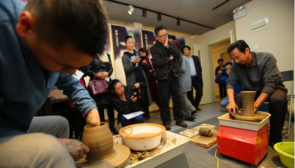 25日下午的展览活动中,天津、浙江两地传承人在现场拉坯制作,本市非遗保护部门的领导向以“陶冶”治学的宁河县板桥中学校长高志全赠送青瓷,鼓励他们在少儿传承工作中做出的努力。