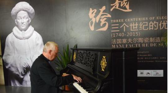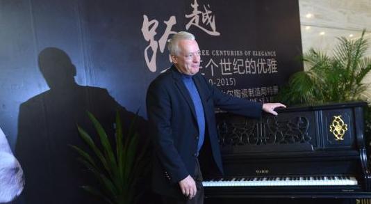 斯皮格雷成都参观塞夫尔陶瓷展即兴演奏钢琴曲。